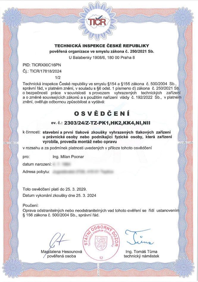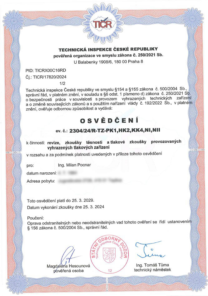 Osvědčení pro revize tlakových zařízení typu R.